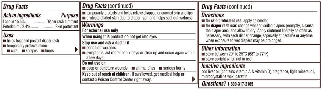 Lanolin 15.5% (Diaper Rash Ointment), Petrolatum 53.4% (Skin Protectant), Cod Liver Oil (Contains Vitamin A & Vitamin D), Fragrance, Light Mineral Oil, Microcrystalline, Wax, Paraffin.