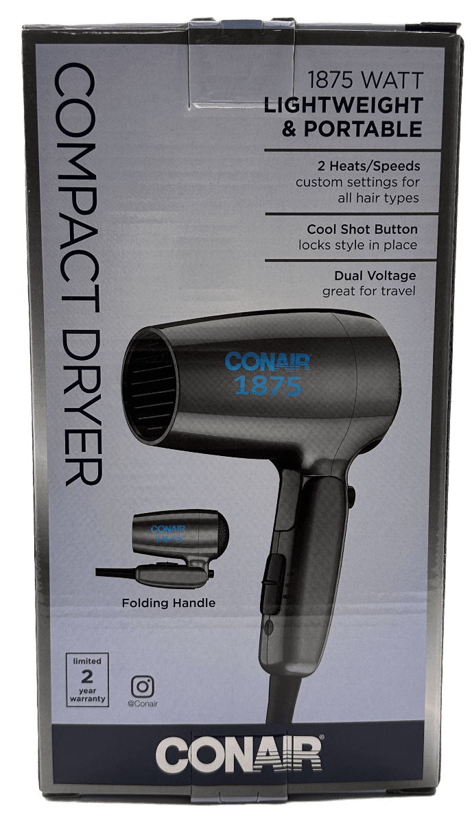 Perfect for travel, whether you’re going to the gym in town or trekking across the globe, this compact dryer combines convenience with performance. Lightweight and portable, with a folding handle, it’s an easy fit in any tote or duffle bag. 1875 watts of power and 2 heat and speed settings makes this dryer a must for anyone who wants to keep their hair perfectly styled wherever their busy life takes them. Dual voltage makes it safe for use worldwide.