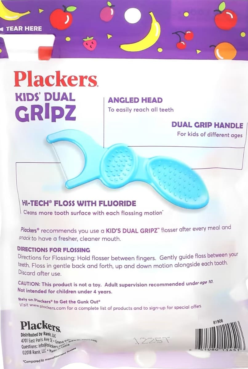 Plackers – Kids’ Dual Gripz – 75 Dental Flossers With Fluoride – Fruit Smoothie Swirl