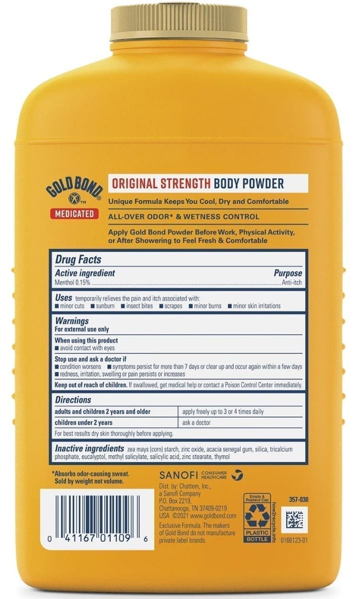Gold Bond Medicated Original Strength Powder’s unique triple action formula absorbs moisture, cools, and relieves itch so you feel fresh. It provides all over odor* and wetness control and contains a plant-based ingredient. Apply Gold Bond before work, physical activity, or after showering to keep you cool, dry, and comfortable.