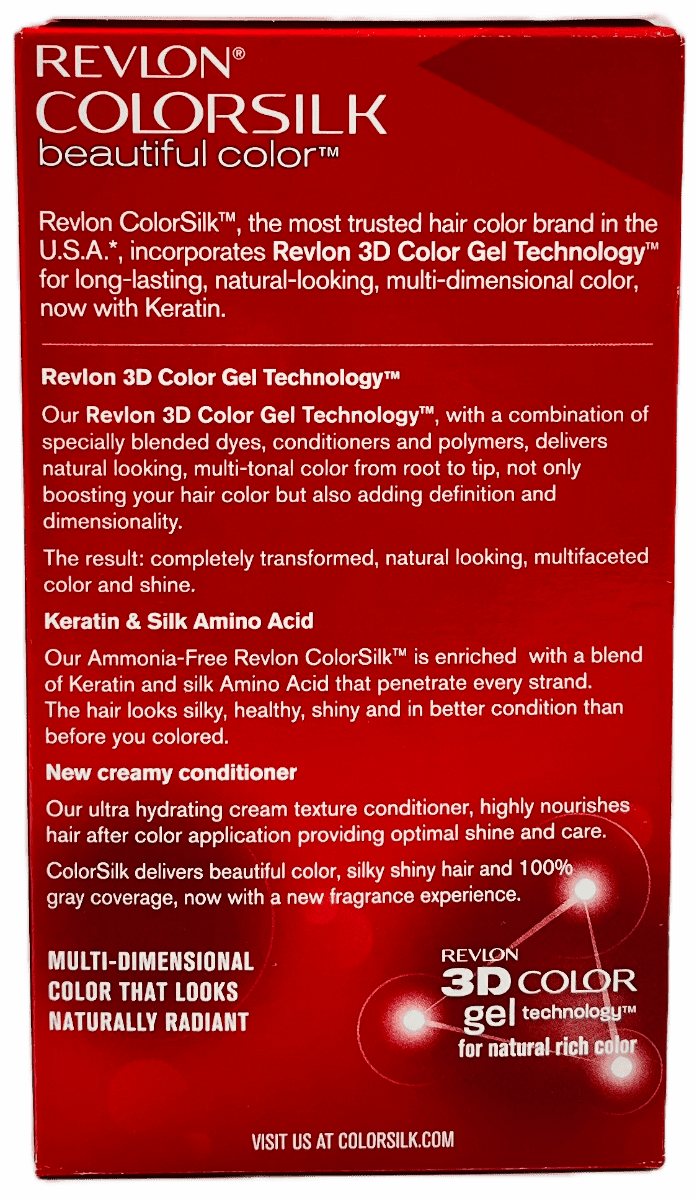 Revlon ColorSilk, the most trusted hair color brand in the U.S.A.*, incorporates Revlon 3D Color Gel Technology for long-lasting, natural-looking, multi-dimensional color, now with Keratin.