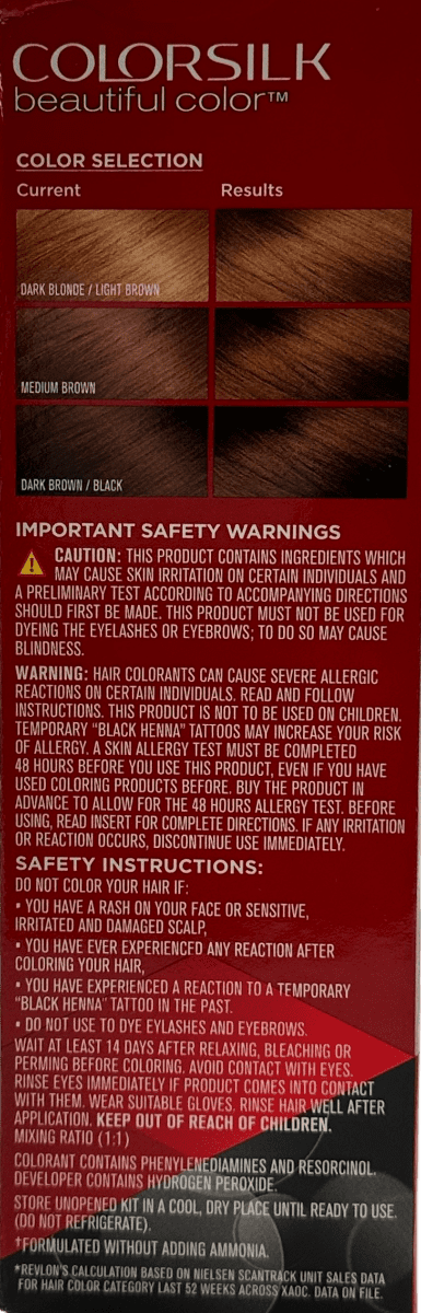 Hair colorants can cause severe allergic reactions on certain individuals. Read and follow instructions. This product is not to be used on children. Temporary “Black henna” tattoos may increase your risk of allergy. A skin allergy test must be completed 48 hours before you use this product, even if you have used coloring products before. Buy the product in advance to allow for the 48 hours allergy test. Before using, read insert for complete directions. If any irritation or reaction occurs, discontinue use immediately.