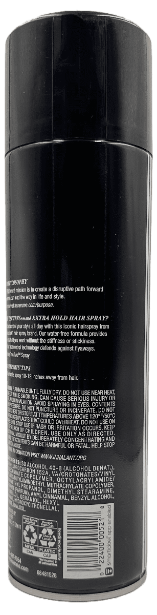 Flammable Until Fully Dry. Do Not Use Tresemme Hair Spray Near Heat, Flame Or While Smoking. Can Cause Serious Injury Or Death. Avoid Inhalation. Avoid Spraying In Eyes. Contents Under Pressure. Do Not Puncture Or Incinerate. Do Not Expose To Heat Or Store At Temperatures Above 120°f/50°c Or In Enclosed Places That Could Overheat. Do Not Use On Broken Skin. Stop Use If Rash Or Irritation Occurs. Keep Out Of Reach Of Children. Use Tresemme Hair Spray – Extra Hold Only As Directed. Intentional Misuse By Deliberately Concentrating And Inhaling The Contents Can Be Harmful Or Fatal. Help Stop Inhalation Abuse